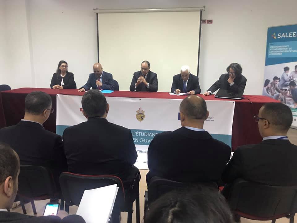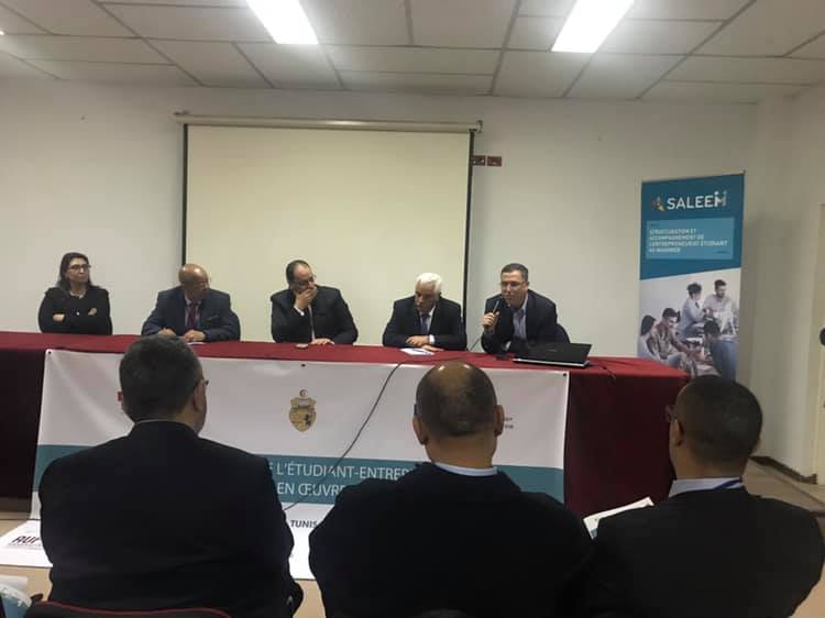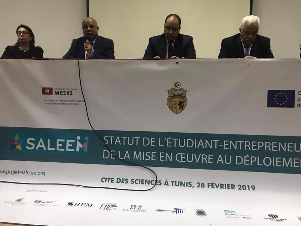 Le projet SALEEM Le colloque de bilan et capitalisation à mi-parcours du projet SALEEM, s’est tenu le 28 février 2019 à la Cité des sciences de Tunis. Statut de l’Etudiant-Entrepreneur : de la mise en œuvre au déploiement Le projet SALEEM est mis en œuvre d’octobre 2017 à octobre 2020 par un consortium de 14 partenaires du Maroc, de Tunisie, de Belgique, de France et de Roumanie. Co-financé par le programme Erasmus+ de l’Union européenne sur une durée de 3 ans, il a pour but de favoriser l’entrepreneuriat étudiant au Maroc et en Tunisie. https://goo.gl/dyfC82